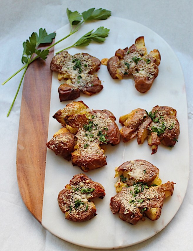 I’ve never met a potato I didn’t like and these are no exception! I feel like ‘Bubba’ from Forest Gump when I talk about my obsession with potatoes “you can boil them, smash them, fry them, bake them…” But for real, this might be my new favorite recipe behind french fries (duh). It’s super easy to make and don’t worry if they fall apart a bit once you smash them. They turn out different every time and I enjoy the smaller crispy bits as well.